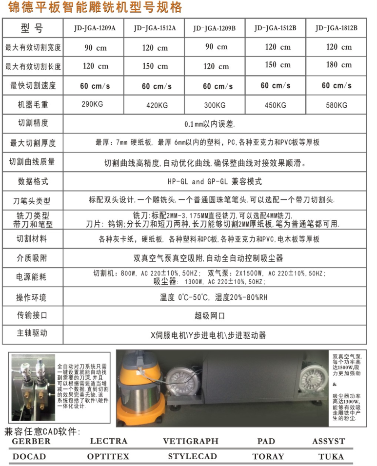 ◆全自動(dòng)對(duì)刀系統(tǒng),祝您輕松換刀,自動(dòng)調(diào)整和找到最佳刀壓數(shù)據(jù),快速而方便。 ◆ 配備有消音器的雙真空泵,能強(qiáng)力吸緊需要切割的亞克力等材料,并且控制其自動(dòng)啟停,切割過(guò)程相對(duì)其他機(jī)器安靜。 ◆電腦全自動(dòng)控制的吸塵器能夠當(dāng)機(jī)器運(yùn)轉(zhuǎn)時(shí)自動(dòng)清理產(chǎn)生的粉塵。 ◆網(wǎng)口超級(jí)智能控制器支持長(zhǎng)距離數(shù)據(jù)傳輸和網(wǎng)絡(luò)化噴繪切割,配備伺服馬達(dá)和驅(qū)