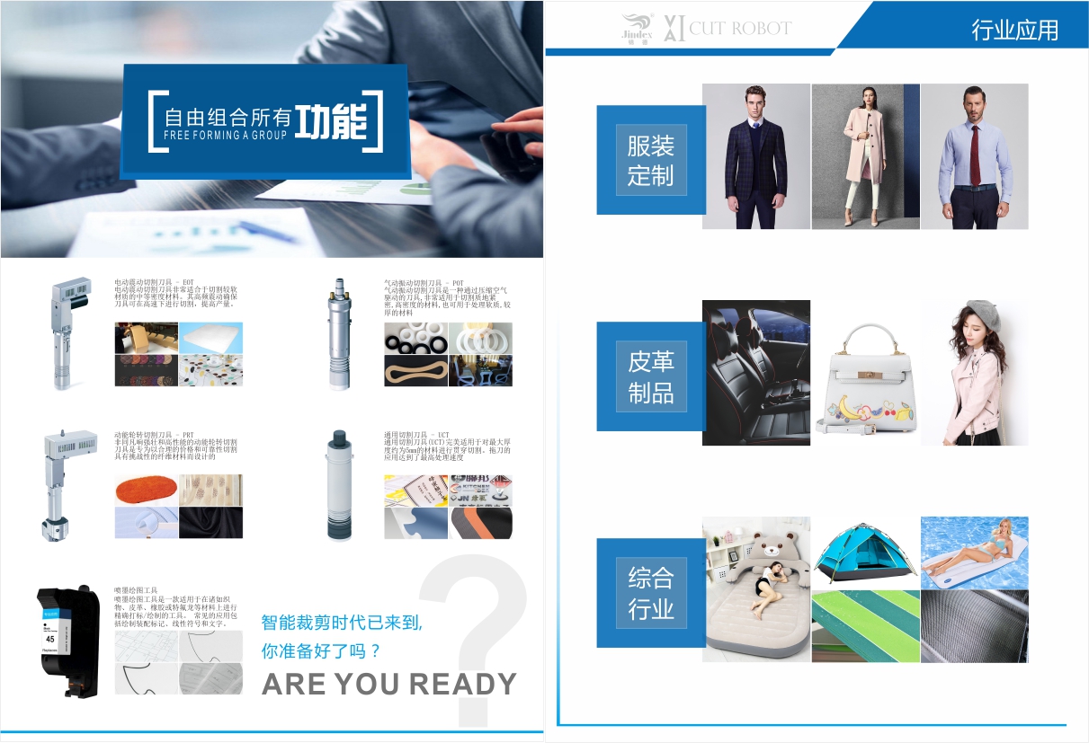 切割布料類型:高級西服\襯衫\內衣\文胸等,采用超長切割臺面,對折布料切割,上面覆蓋薄膜一次性切割兩層.