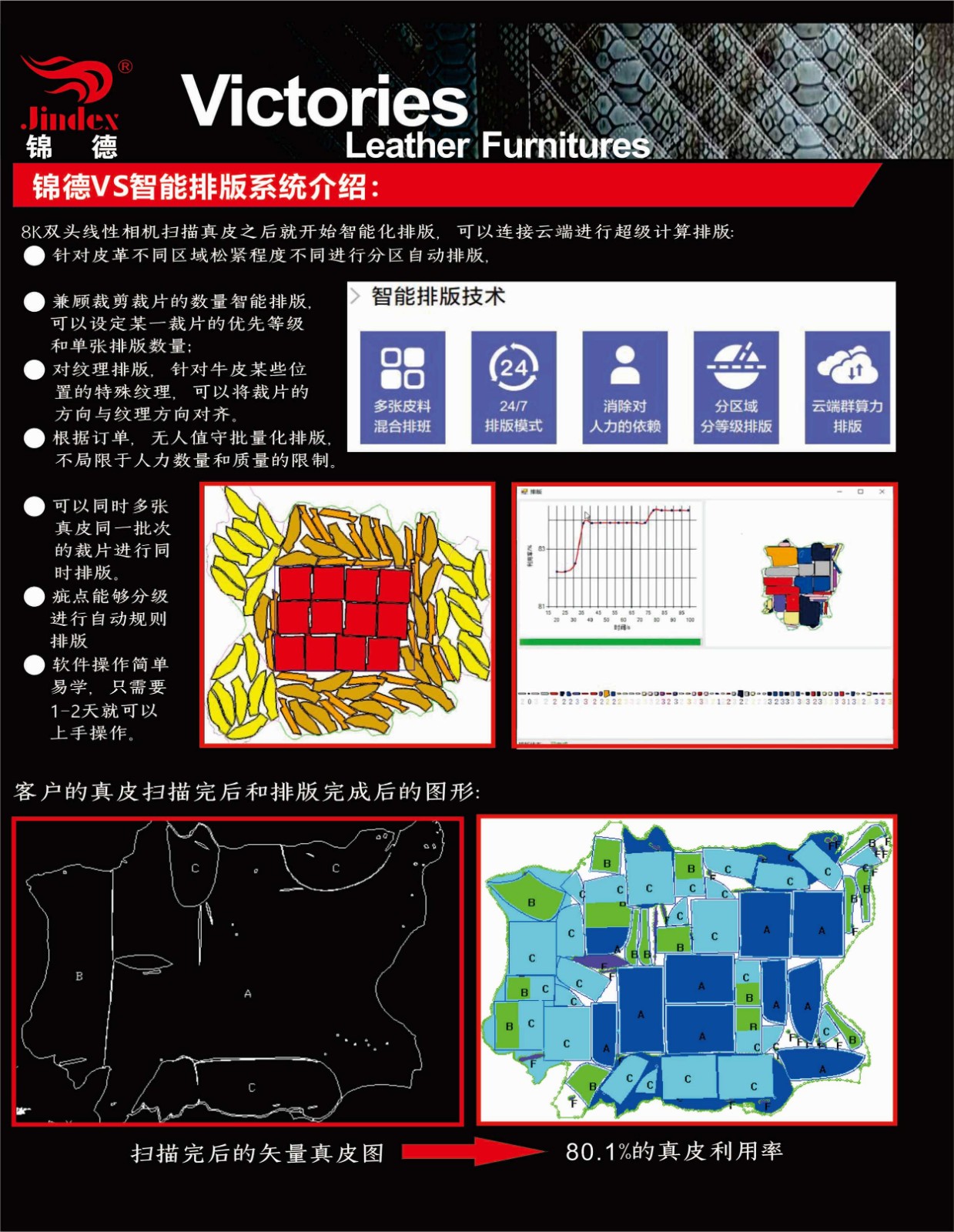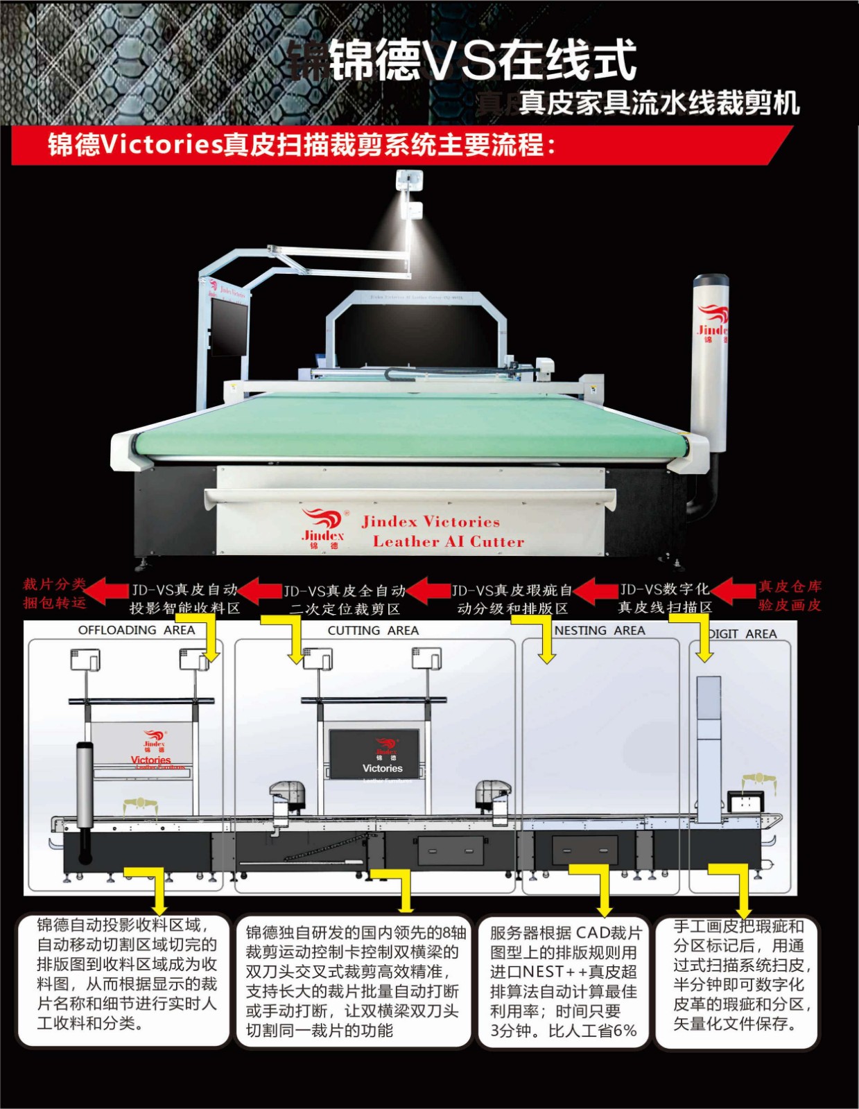 錦德真皮裁剪流水線系統(tǒng)采用先進(jìn)的高清全彩真皮輪廓采集系統(tǒng),通過(guò)高精度掃描提取真皮不規(guī)則輪廓形狀、面積、瑕疵等信息,配合全自動(dòng)排料系統(tǒng),產(chǎn)生優(yōu)化的裁剪方案,獨(dú)特的三段式流水工作平臺(tái),可以發(fā)揮最大裁剪效能,減少勞動(dòng)強(qiáng)度,提升綜合使用能效,裁剪效能較傳統(tǒng)真皮裁剪設(shè)備提升120%以上。